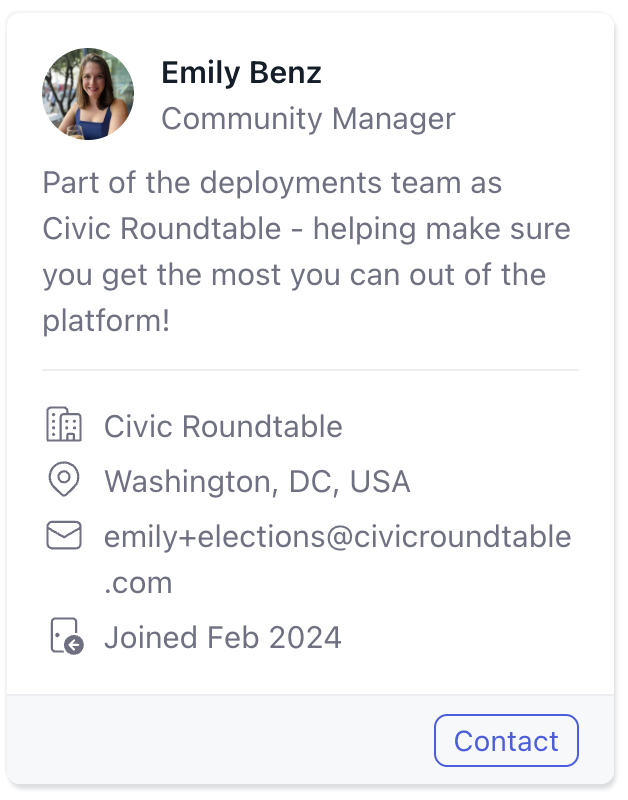 Clicking the “Contact” button at the bottom right of a member’s profile will create a direct messaging thread with that member, allowing you to quickly get in touch and strike up a conversation.
