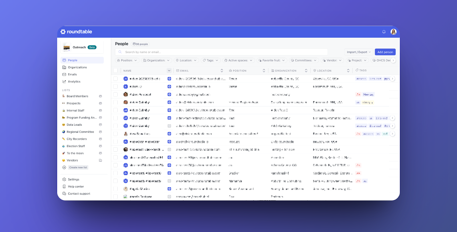 People / Organizations Tab Overview: Access all your records in one organized table with filtering and search capabilities. Export to CSV for external use or analysis.
