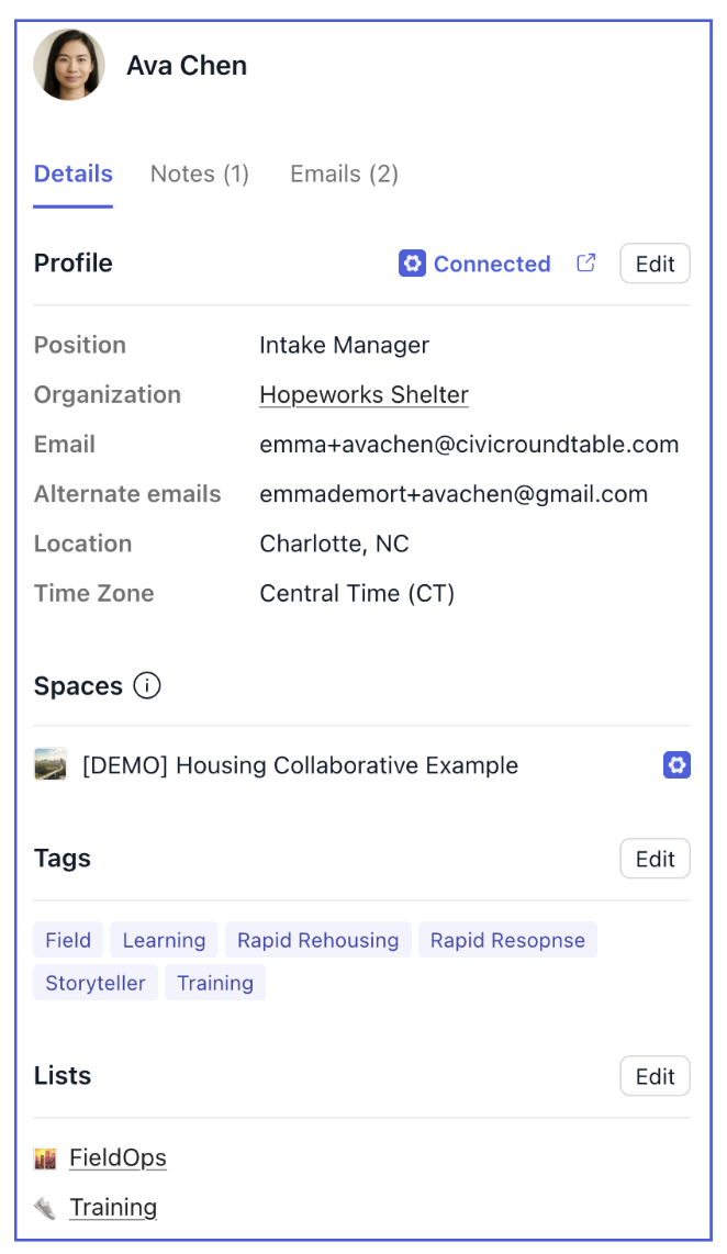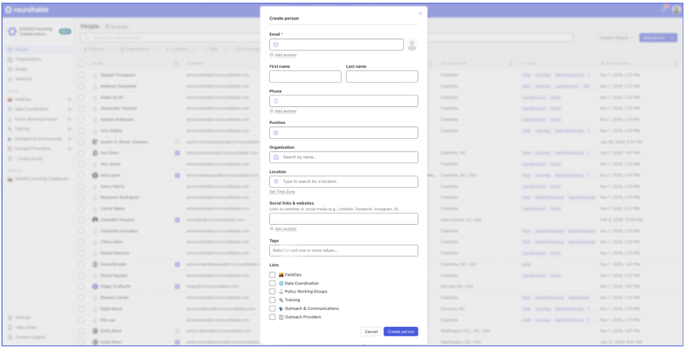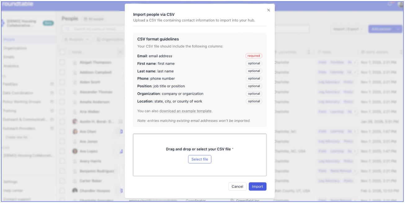 The Roundtable CRM is your centralized place to manage contacts, track engagement, and coordinate outreach — all directly connected to the spaces and work you’re doing in Civic Roundtable.