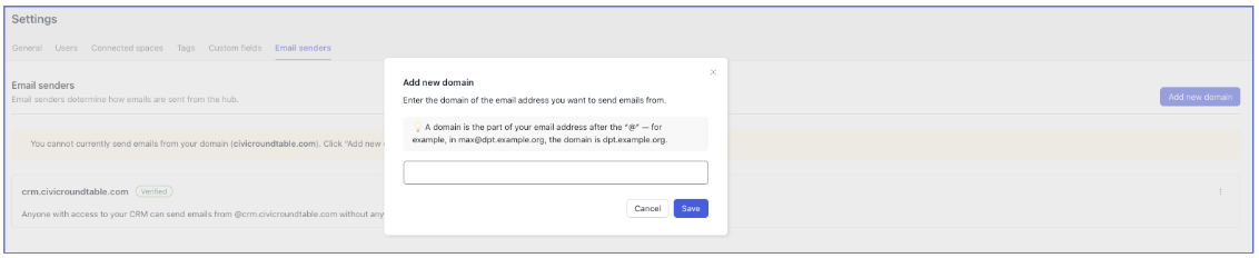 You can send emails via the Roundtable CRM without verifying your domain using our crm.civicroundtable.com. This allows you to start sending emails as soon as you configure your CRM!