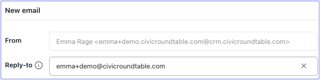 Senders will see your email attached to @crm.civicroundtable.com. You can configure your 'Reply-to' to whatever inbox you choose!