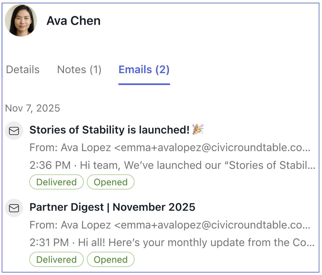 Emails sent via the CRM appear in each person’s Emails tab.