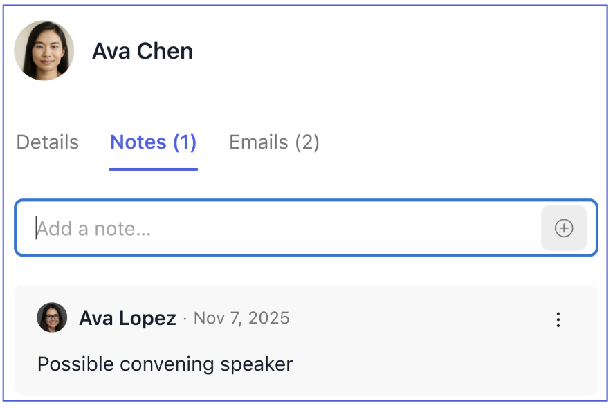 Collaborate with your team using notes to capture ideas, track interactions, and share insights. Notes on person records support threaded conversations and resolution.
