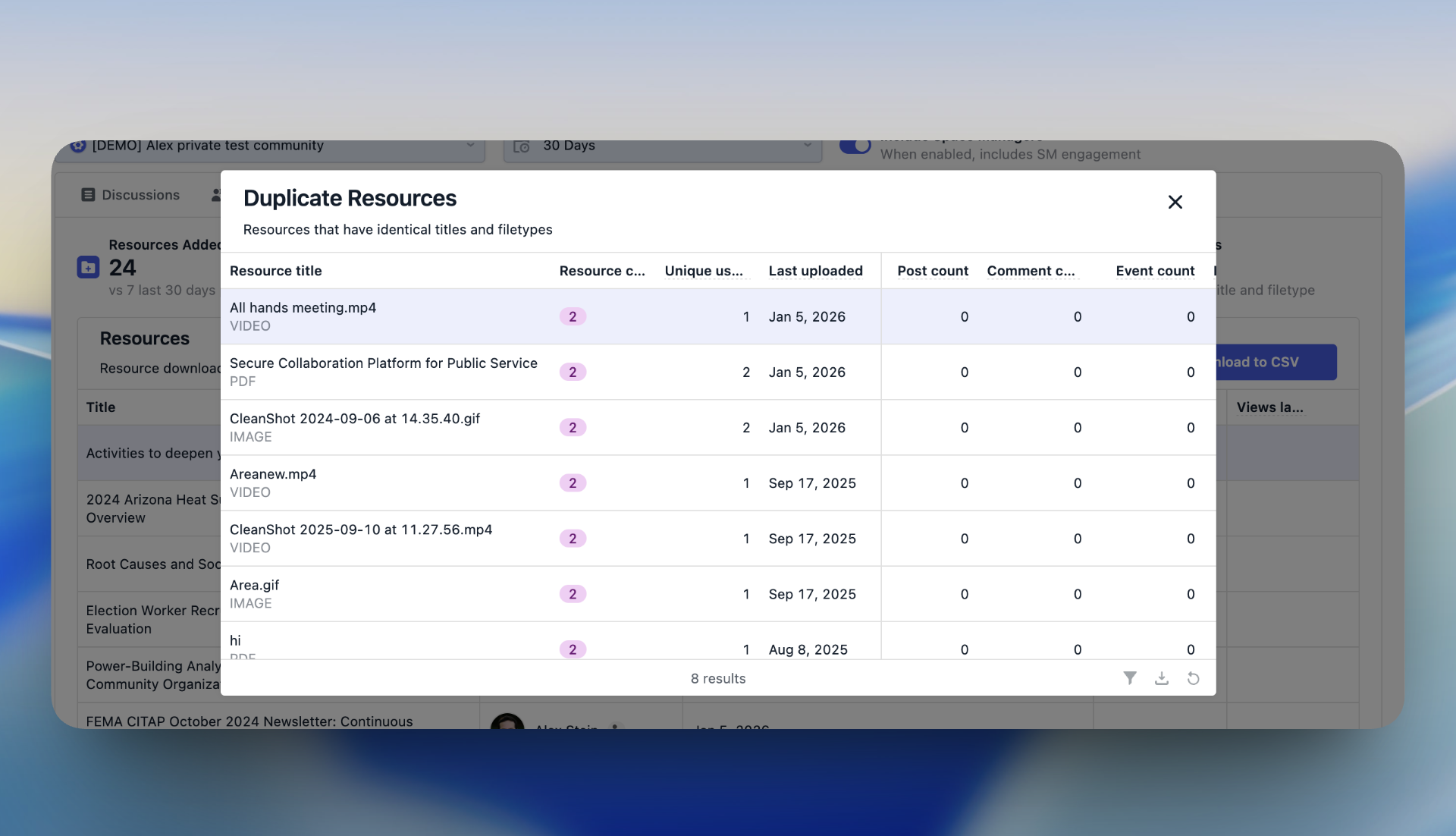 Analytics now helps Space Managers identify duplicate resources within a space. By surfacing files with the same title and file type, this view makes it easier to clean up clutter, reduce confusion, and keep shared resources accurate and up to date. Access this view in Analytics → Resources.
