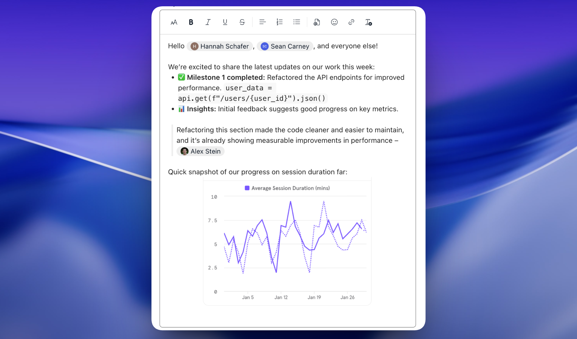 - @Mention button in the toolbar – Quickly tag people without breaking your writing flow.