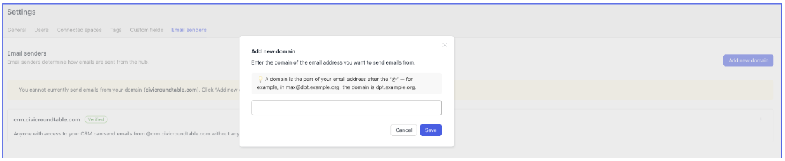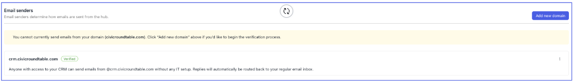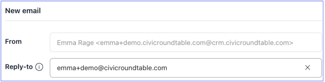 You can send emails via the Roundtable CRM without verifying your domain using our @crm.civicroundtable.com domain. This allows you to start sending emails as soon as you configure your CRM!