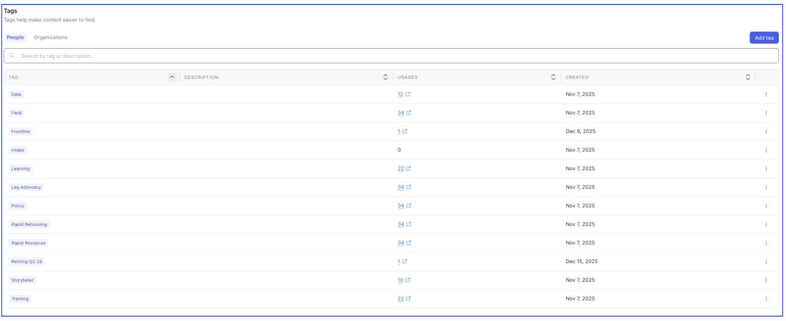 Tags: Label people and organizations for easy searching and grouping
