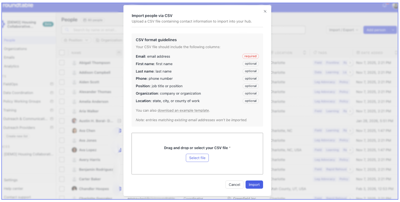 Go to People β Import/Export β Import CSV