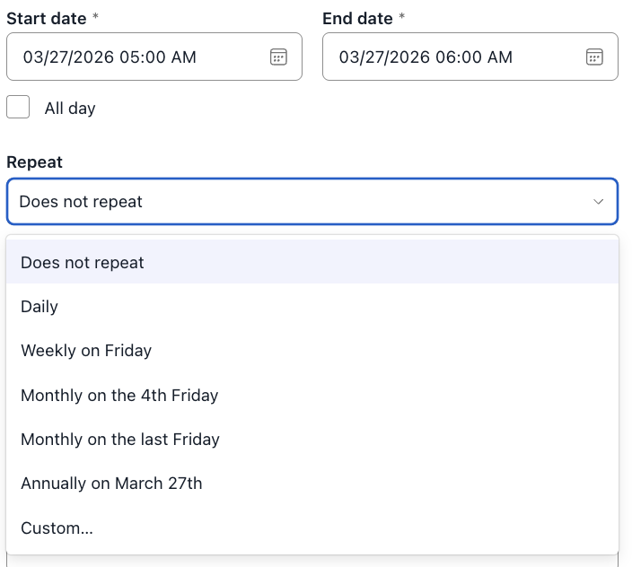 Recurring events let you schedule something once and have it automatically repeat on whatever cadence fits your workflow — whether that's a weekly team sync, a monthly all-hands, or a daily standup. Here's everything you need to know to get started and stay in control.