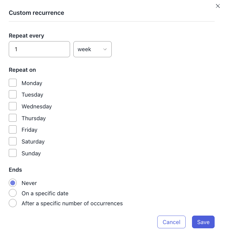 - Configure the details for that frequency — for example, which day(s) of the week for a weekly event.